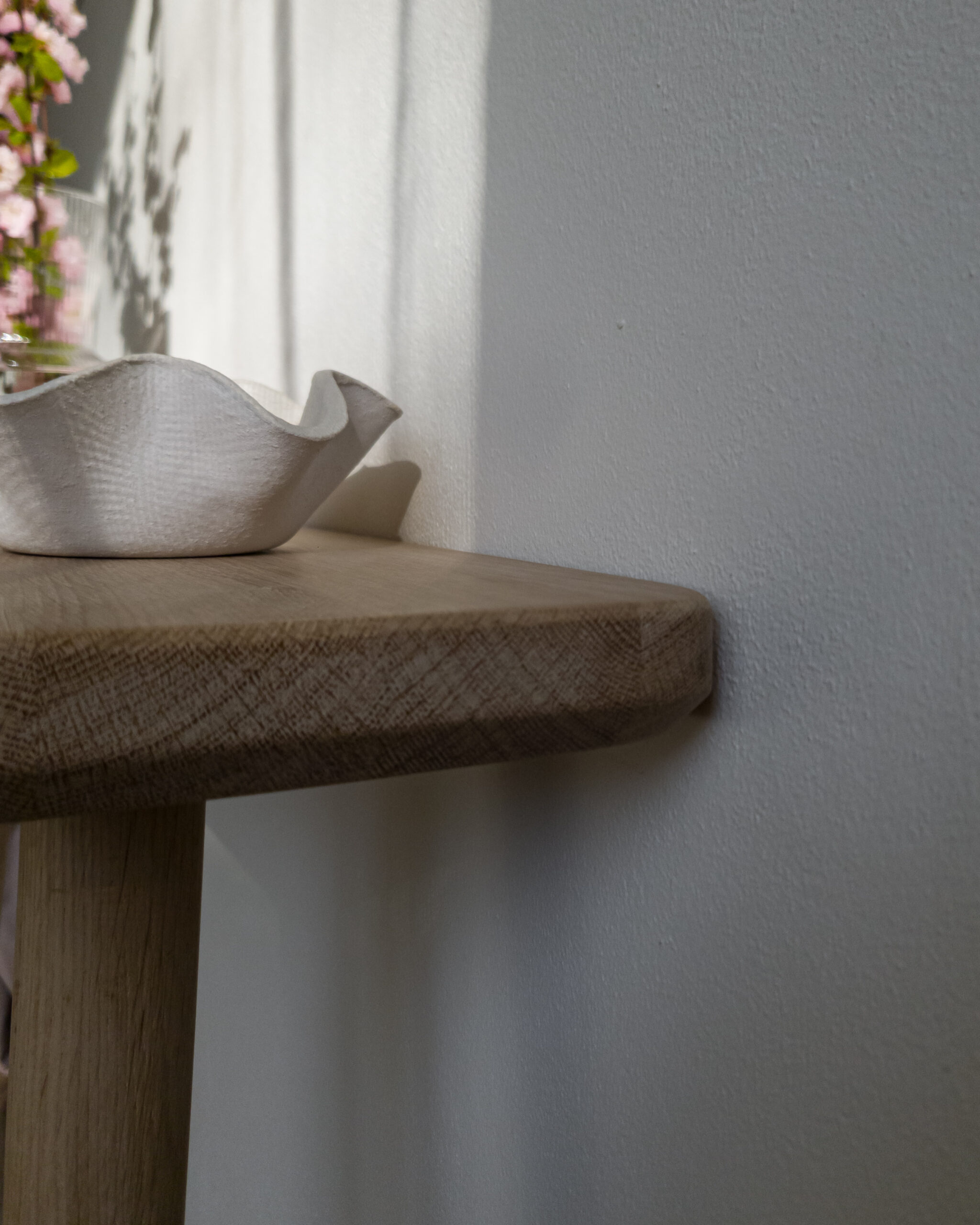 Minimalistyczna dębowa konsola MODENA z zaokrąglonym tyłem łączy prostotę formy z naturalnym pięknem drewna. Wykonana ręcznie z litego dębu, idealna jako lśniący detal Twojego wnętrza.