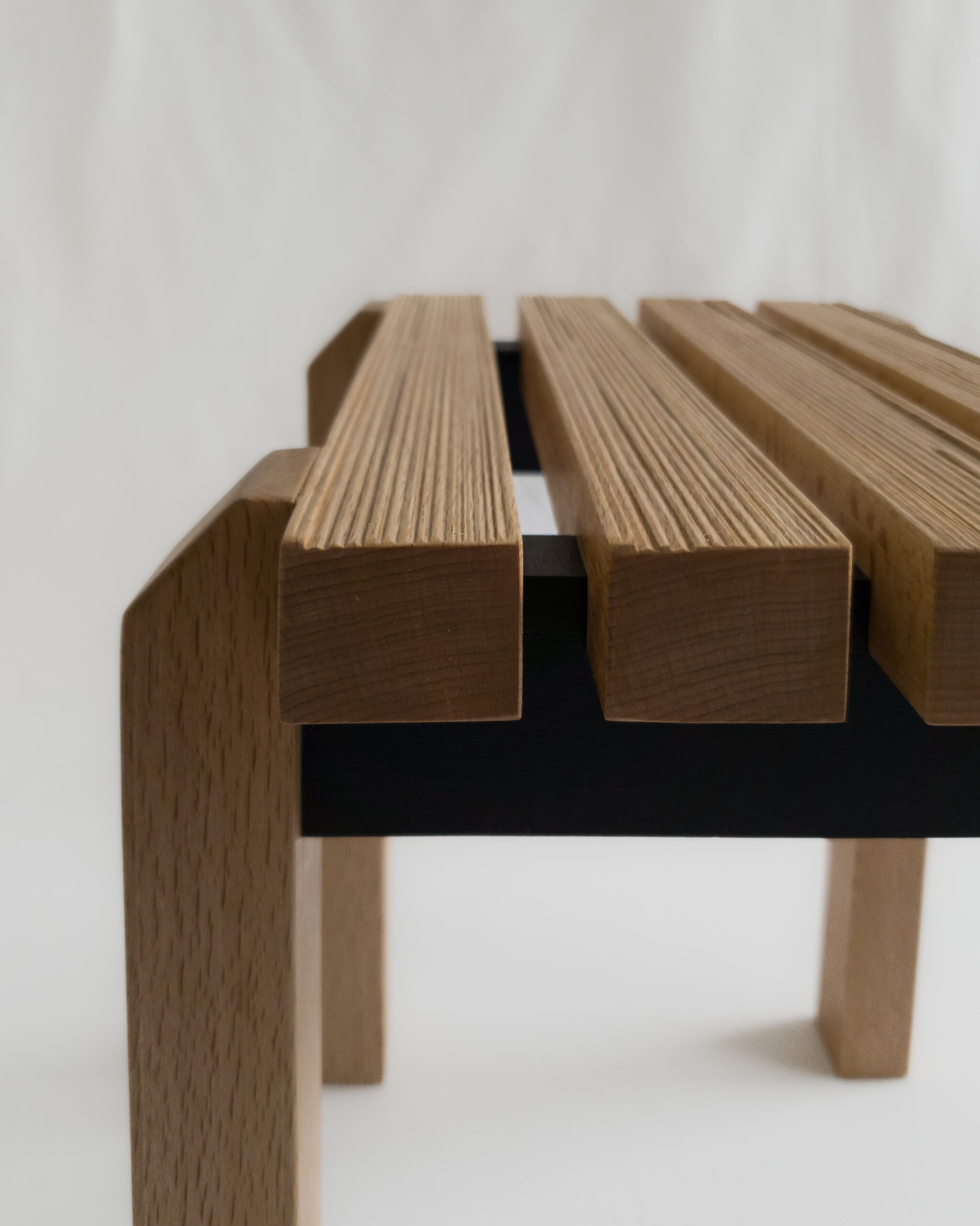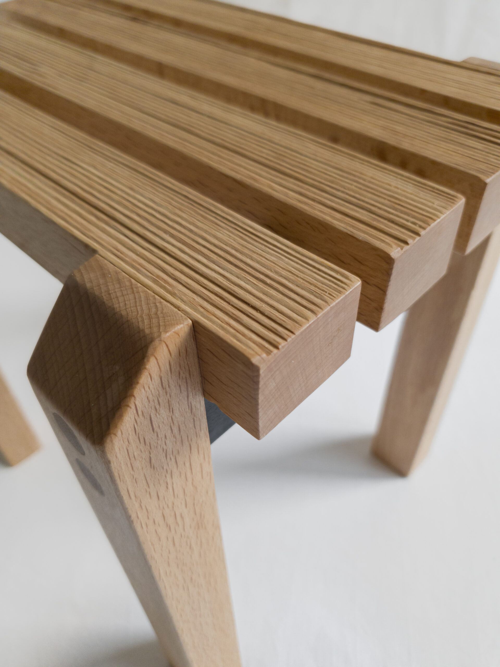 Górną część stołka zdobią cztery lamele, którym nadaliśmy niepowtarzalną strukturę.